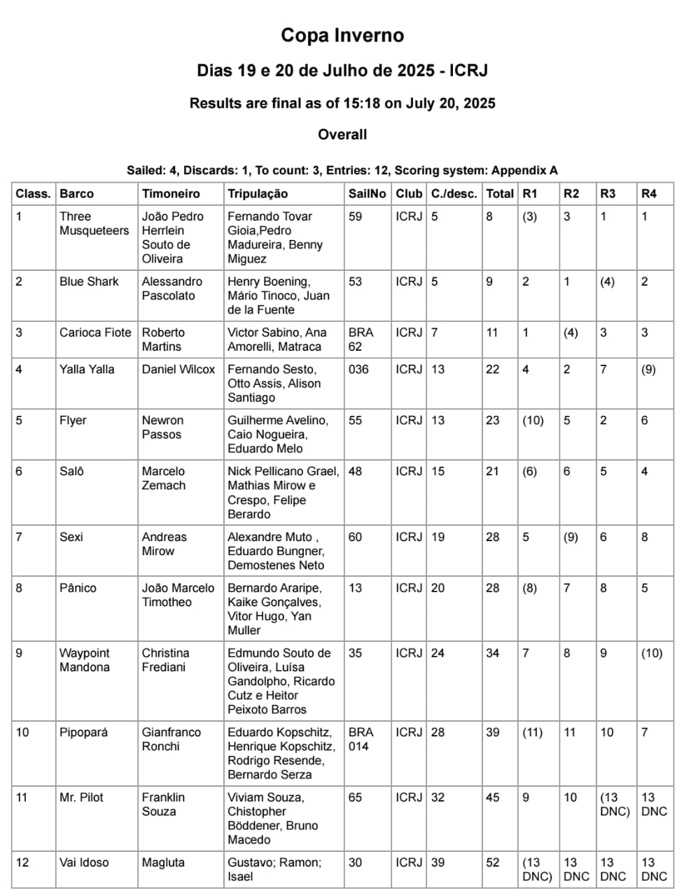 A primeira colocação geral, aliás, ficou com a nova equipe do veleiro Three Musketeers, agora do comandante Jõao Pedro Herlein Souto de Oliveira. Ele e os tripulantes Fernando Tovar Gioia, Pedro Madureira e Benny Miguez, venceram duas das quatro regatas e chegaram na terceira colocação nas demais.